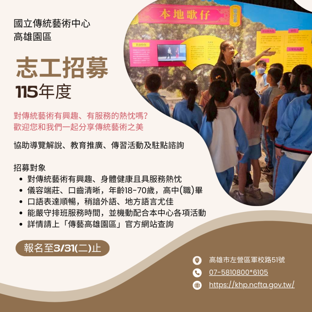 【轉知】國立傳藝高雄園區「115年志工招募」3月31日受理報名截止