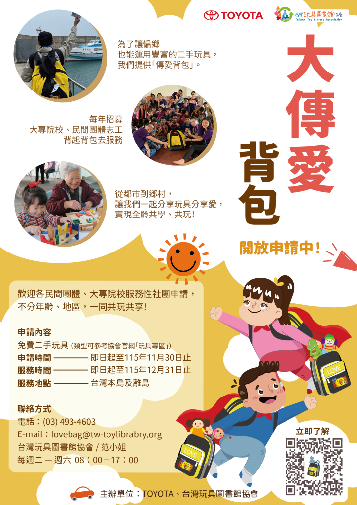 今年台灣玩具圖書館與 TOYOTA 攜手合作邁入第11年,誠摯地邀請志工團隊、教育單位、社福機構…等神隊友,一同揹起「傳愛背包」,發揮背包的機動性與玩具的多變可能,創造更多笑容!