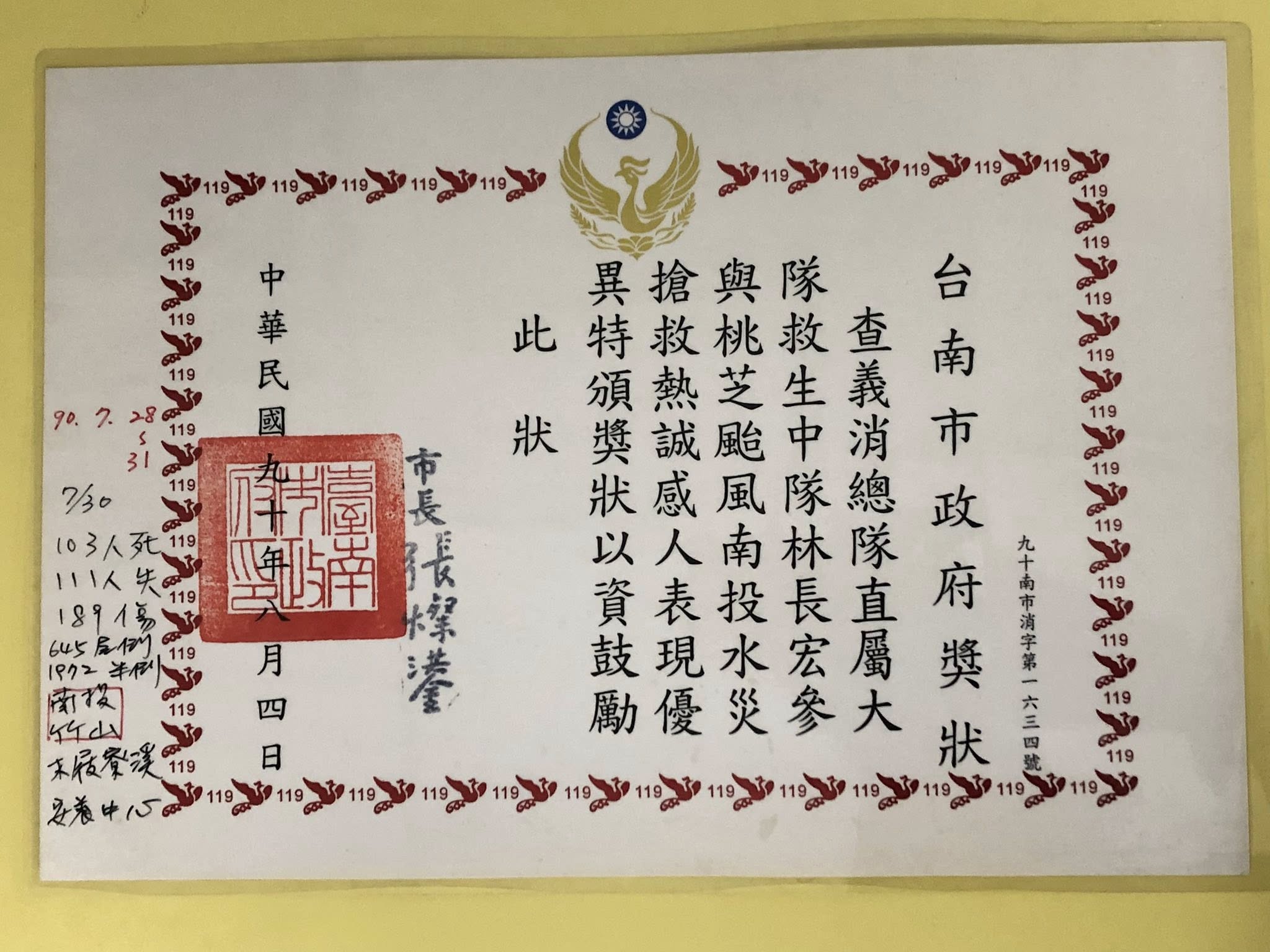 林長宏曾在建興國中任教近30年,個性積極熱情,因擅長游泳,還在學校任教時期已加入義消救生中隊,長年守護著在運河邊、海邊的民眾,及投身風災水災救難行動,曾獲頒「義消楷模」等多個獎項。