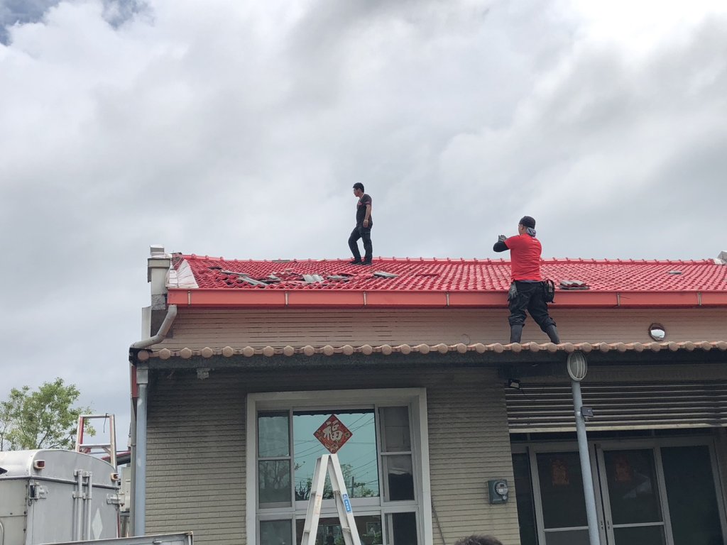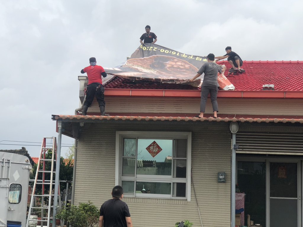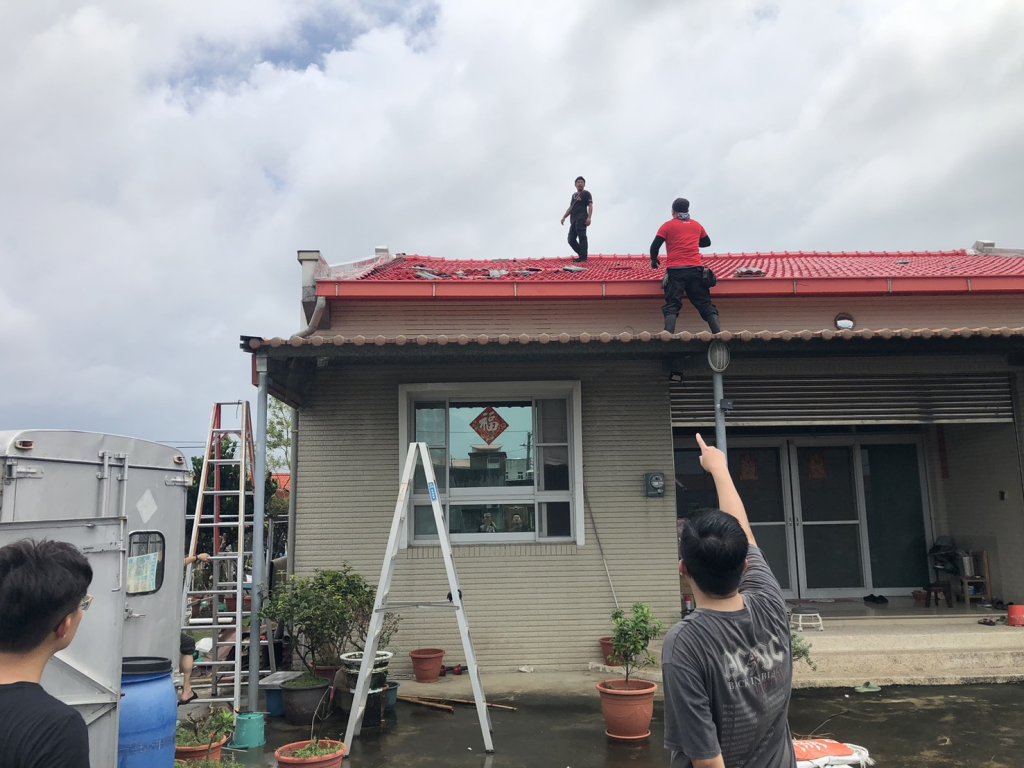 頂洲社區位處偏鄉,社區內有許多舊式平房,這次風災中,許多住戶屋頂嚴重受損,導致屋外下大雨、屋內下小雨。志工們有時頂著烈日,有時冒著雨勢,為住戶搭設帆布臨時遮蔽,協助防止進一步雨水滲入,讓受災家庭得以暫時安頓,度過難關。
