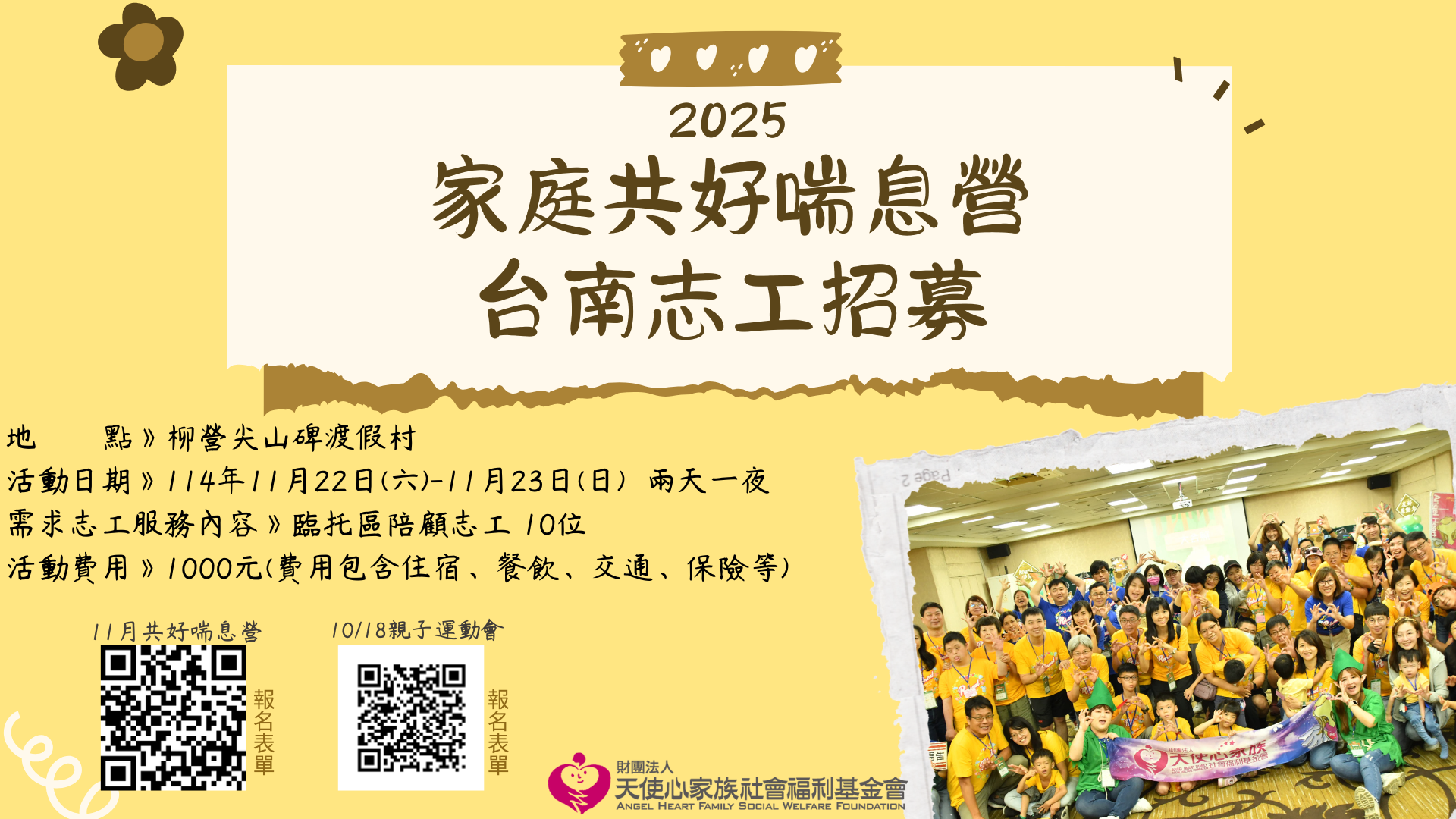 多年來,天使心家族秉持著「父母先走出來,孩子才有希望」的理念,透過各項服務來陪伴愛奇兒的父母及其健康手足,天使心家族台南服務處將於114/11/22-11/23舉辦 天使心家庭共好喘息營活動