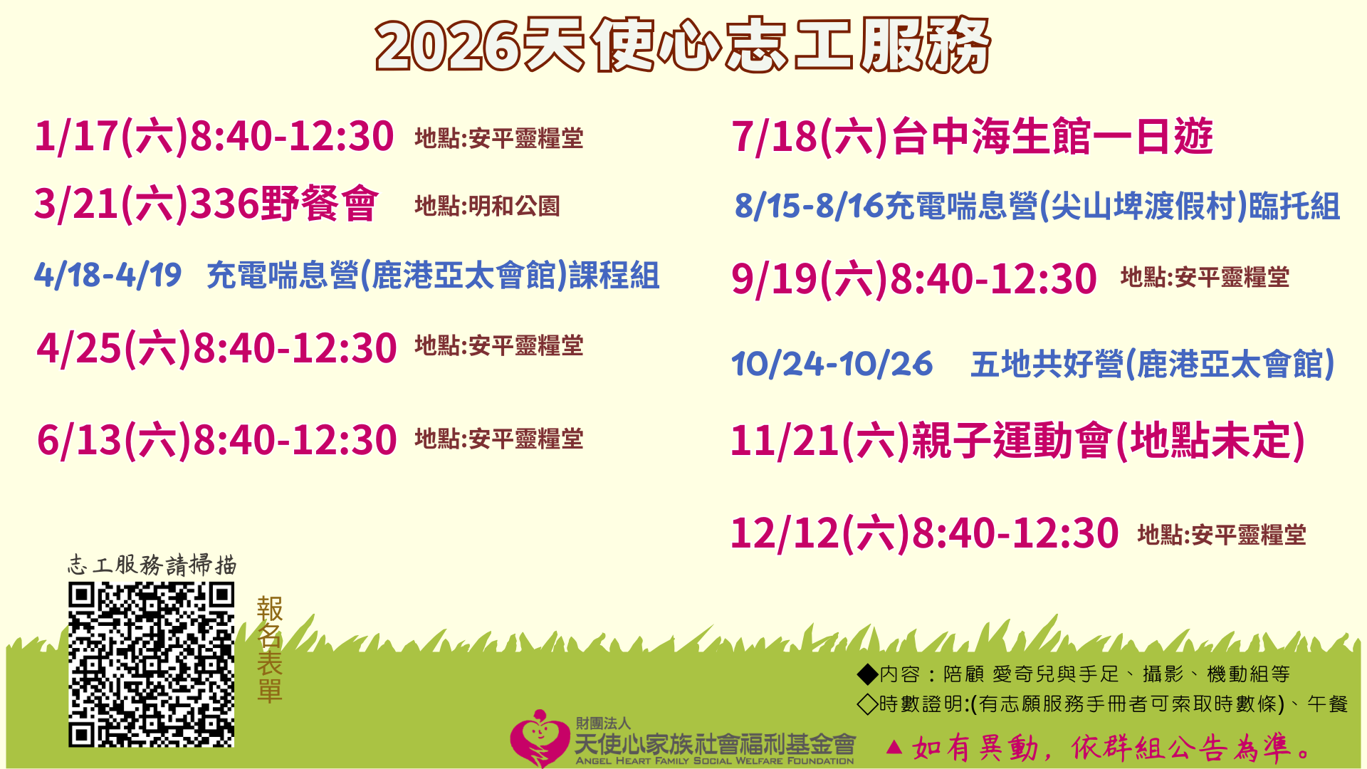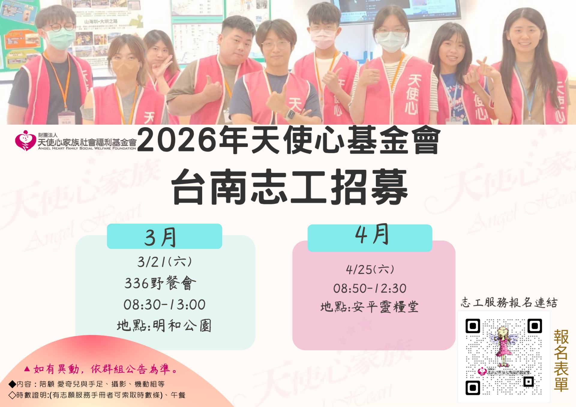 若有任何疑問,歡迎您 ☎ 電洽 (06)2200126#11 志工專員 彥安