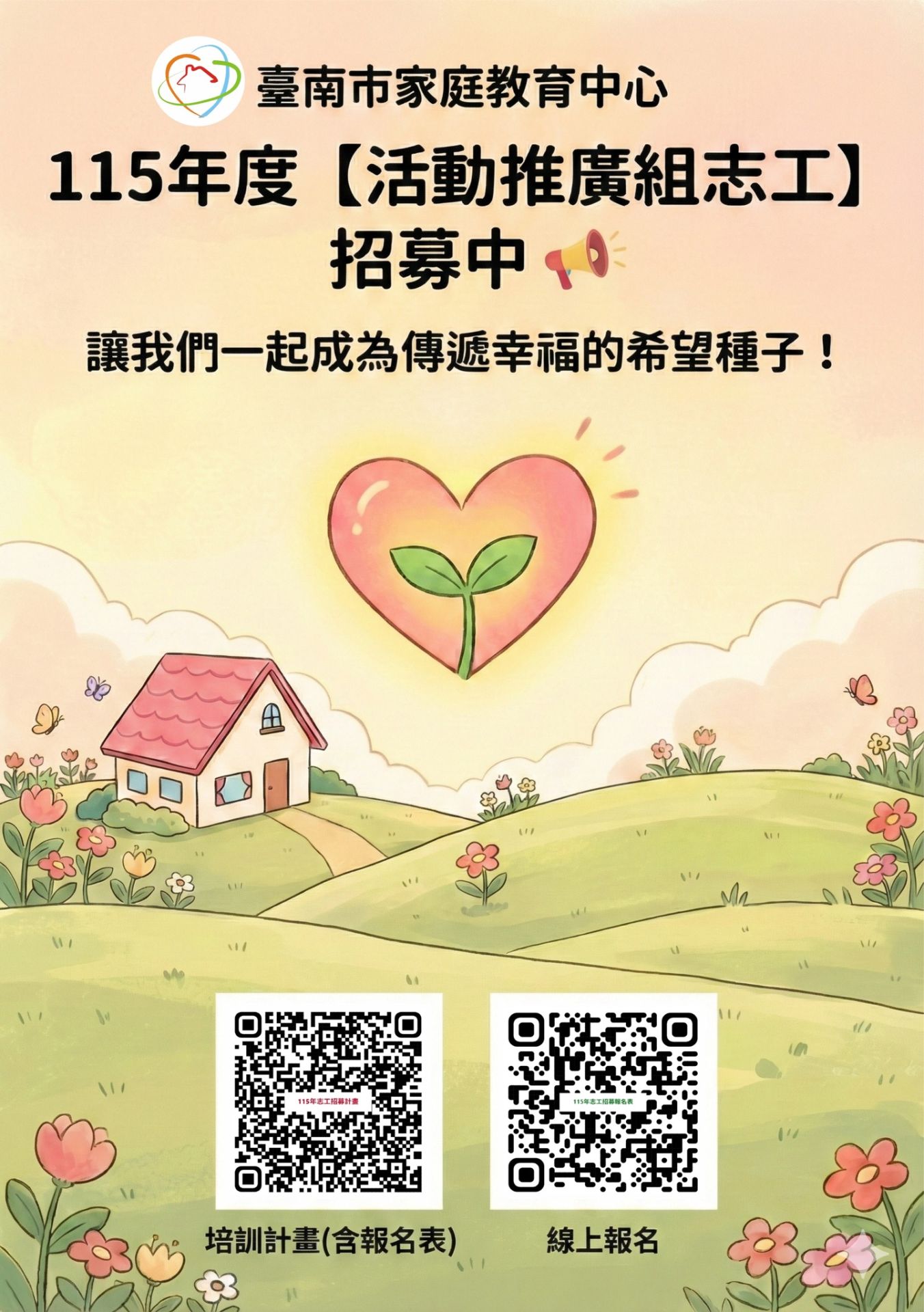 ❤️ 臺南市家庭教育中心 115 年度「活動推廣組志工」招募正式開始囉!