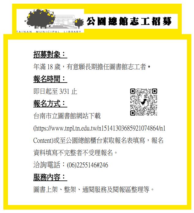 臺南市立圖書館-公園總館志工招募